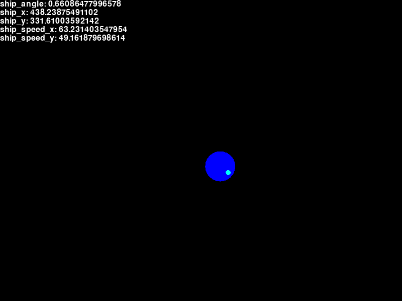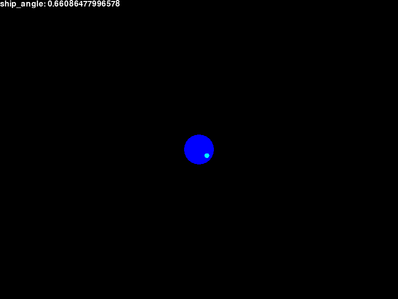 import math ship_x = 800 / 2 ship_y = 600 / 2 ship_angle = 0 def update(dt): global ship_angle if keyboard.right: ship_angle += 10 * dt def draw(): screen.fill((0, 0, 0)) screen.draw.filled_circle((ship_x, ship_y), 30, color=(0, 0, 255)) ship_circle_distance = 20 screen.draw.filled_circle(( ship_x + math.cos(ship_angle) * ship_circle_distance, ship_y + math.sin(ship_angle) * ship_circle_distance), 5, color=(0, 255, 255) ) # Temporary screen.draw.text('ship_angle: ' + str(ship_angle), (0, 0))