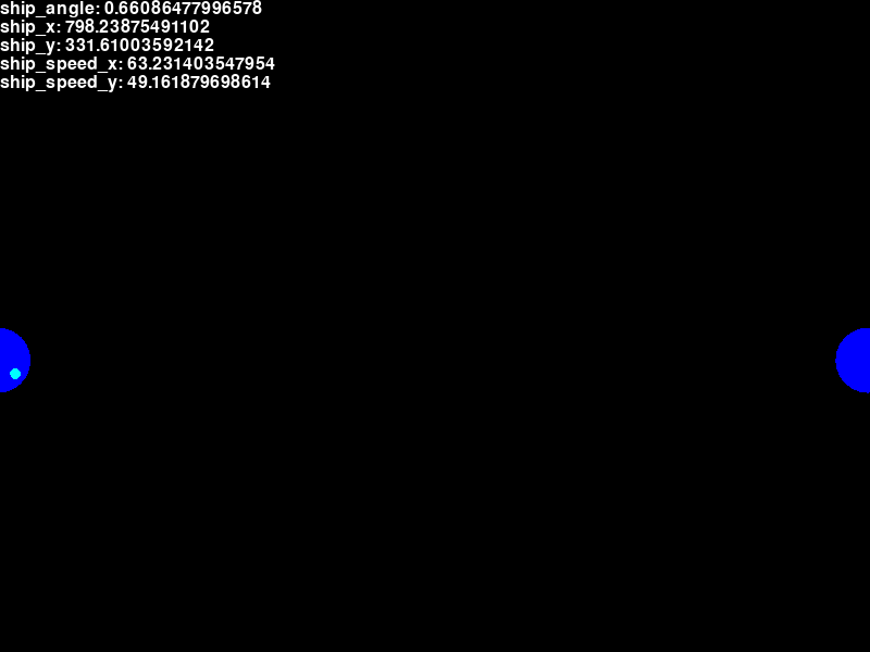 # etc. ship_speed_x = 0 ship_speed_y = 0 def update(dt): global ship_x global ship_y global ship_speed_x global ship_speed_y # etc. if keyboard.up: ship_speed = 100 ship_speed_x += math.cos(ship_angle) * ship_speed * dt ship_speed_y += math.sin(ship_angle) * ship_speed * dt ship_x += ship_speed_x * dt ship_y += ship_speed_y * dt def draw(): # etc. # Temporary screen.draw.text( 'ship_angle: ' + str(ship_angle) + '\n' + 'ship_x: ' + str(ship_x) + '\n' + 'ship_y: ' + str(ship_y) + '\n' + 'ship_speed_x: ' + str(ship_speed_x) + '\n' + 'ship_speed_y: ' + str(ship_speed_y), (0, 0))