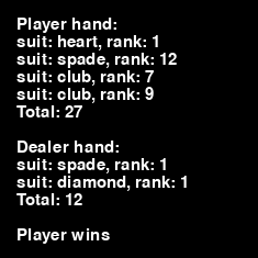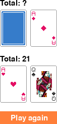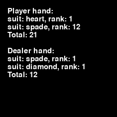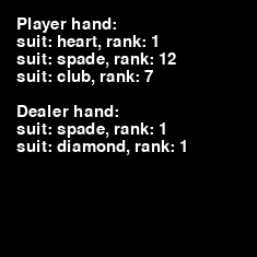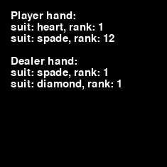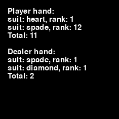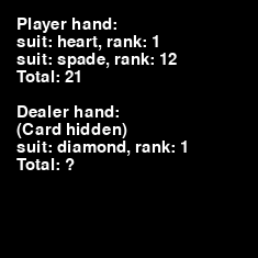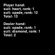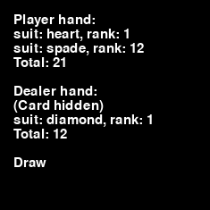 def reset(): global deck global player_hand global dealer_hand global round_over deck = [] for suit in ('club', 'diamond', 'heart', 'spade'): for rank in range(1, 14): deck.append({'suit': suit, 'rank': rank}) player_hand = [] take_card(player_hand) take_card(player_hand) dealer_hand = [] take_card(dealer_hand) take_card(dealer_hand) round_over = False reset() def on_key_down(key): global round_over if not round_over: if key == keys.H: take_card(player_hand) elif key == keys.S: round_over = True else: reset()