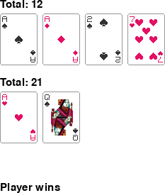 def draw(): # etc. def get_total(hand): total = 0 has_ace = False for card in hand: if card['rank'] > 10: total += 10 else: total += card['rank'] if card['rank'] == 1: has_ace = True if has_ace and total <= 11: total += 10 return total # etc.