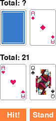 # Moved def get_total(hand): # etc. def on_key_down(key): global round_over if not round_over: if key == keys.H: take_card(player_hand) if get_total(player_hand) >= 21: round_over = True elif key == keys.S: round_over = True else: reset()