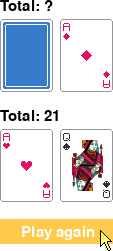 def on_mouse_up(): global round_over if not round_over: if is_mouse_in_button(button_hit): take_card(player_hand) if get_total(player_hand) >= 21: round_over = True elif is_mouse_in_button(button_stand): round_over = True if round_over: while get_total(dealer_hand) < 17: take_card(dealer_hand) elif is_mouse_in_button(button_play_again): reset()