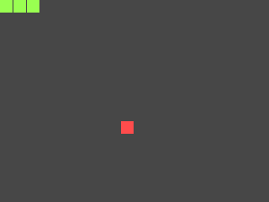 def draw(): # etc. snake_segments = [ {'x': 2, 'y': 0}, {'x': 1, 'y': 0}, {'x': 0, 'y': 0}, ] for segment in snake_segments: screen.draw.filled_rect( Rect( segment['x'] * cell_size, segment['y'] * cell_size, cell_size - 1, cell_size - 1 ), color=(165, 255, 81) )