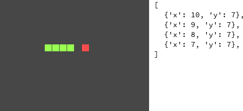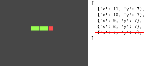 def draw(): # etc. for segment in snake_segments: color = (165, 255, 81) if not snake_alive: color = (140, 140, 140) draw_cell(segment['x'], segment['y'], color) # etc.