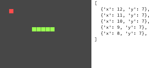 import random # etc. food_position = { 'x': random.randint(0, grid_x_count - 1), 'y': random.randint(0, grid_y_count - 1), } def draw(): # etc. screen.draw.filled_rect( Rect( food_position['x'] * cell_size, food_position['y'] * cell_size, cell_size - 1, cell_size - 1 ), color=(255, 76, 76) )