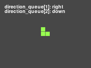 # Removed: direction = 'right' direction_queue = ['right'] def update(dt): global timer timer += dt if timer >= 0.15: timer = 0 if len(direction_queue) > 1: direction_queue.pop(0) # etc. if direction_queue[0] == 'right': next_x_position += 1 elif direction_queue[0] == 'left': next_x_position -= 1 elif direction_queue[0] == 'down': next_y_position += 1 elif direction_queue[0] == 'up': next_y_position -= 1 # etc. def on_key_down(key): # Removed: global direction if (key == keys.RIGHT and direction_queue[-1] != 'left'): direction_queue.append('right') elif (key == keys.LEFT and direction_queue[-1] != 'right'): direction_queue.append('left') elif (key == keys.DOWN and direction_queue[-1] != 'up'): direction_queue.append('down') elif (key == keys.UP and direction_queue[-1] != 'down'): direction_queue.append('up') def draw(): # etc. # Temporary for direction_index, direction in enumerate(direction_queue): screen.draw.text( 'direction_queue[' + str(direction_index) + ']: ' + direction, (15, 15 + 15 * direction_index) )